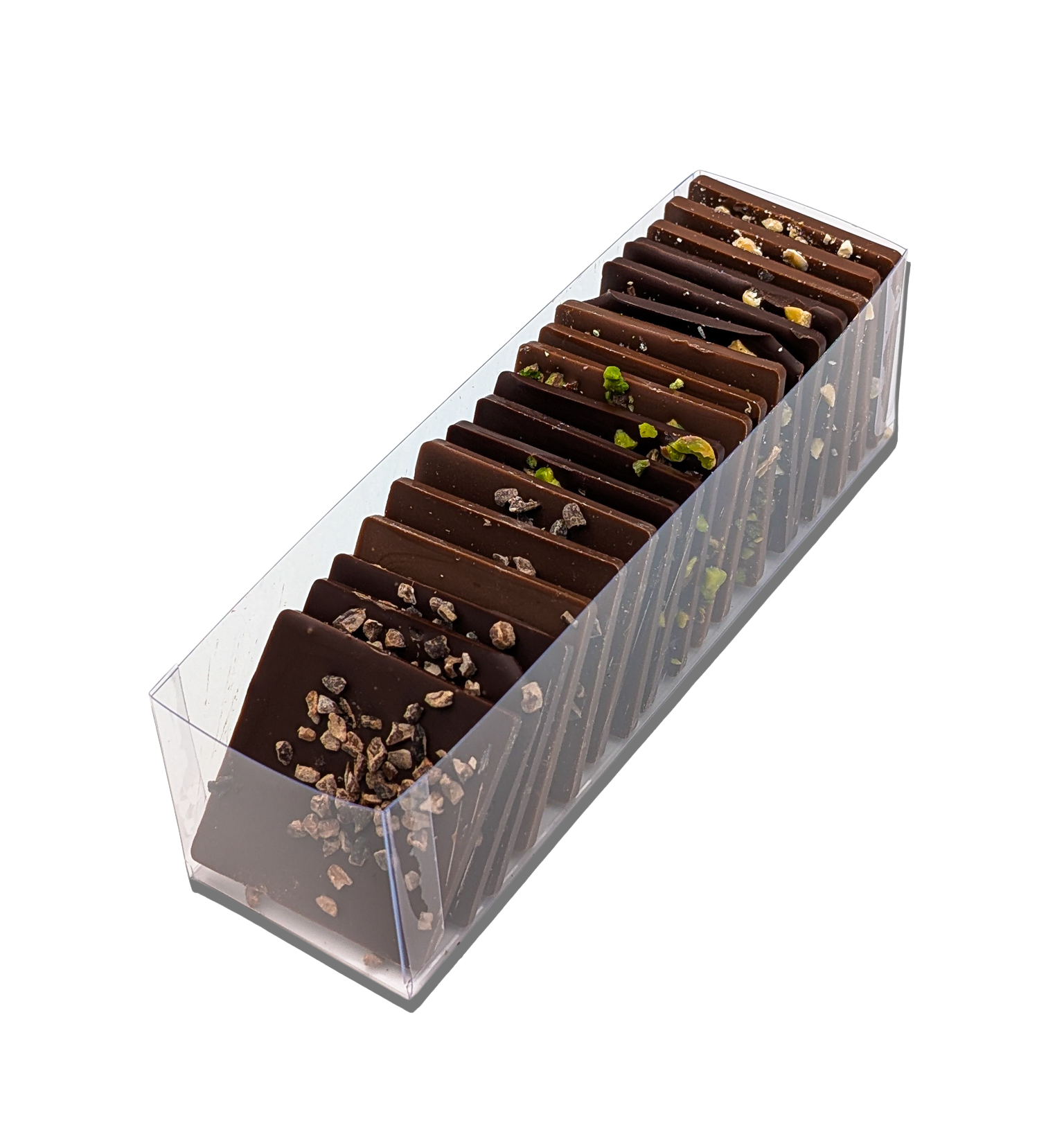 Ingrédients : pâte de cacao, sucre, beurre de cacao, émulsifiant : lécithine de soja, vanille, lait, noisettes ou pistaches ou grué de cacao